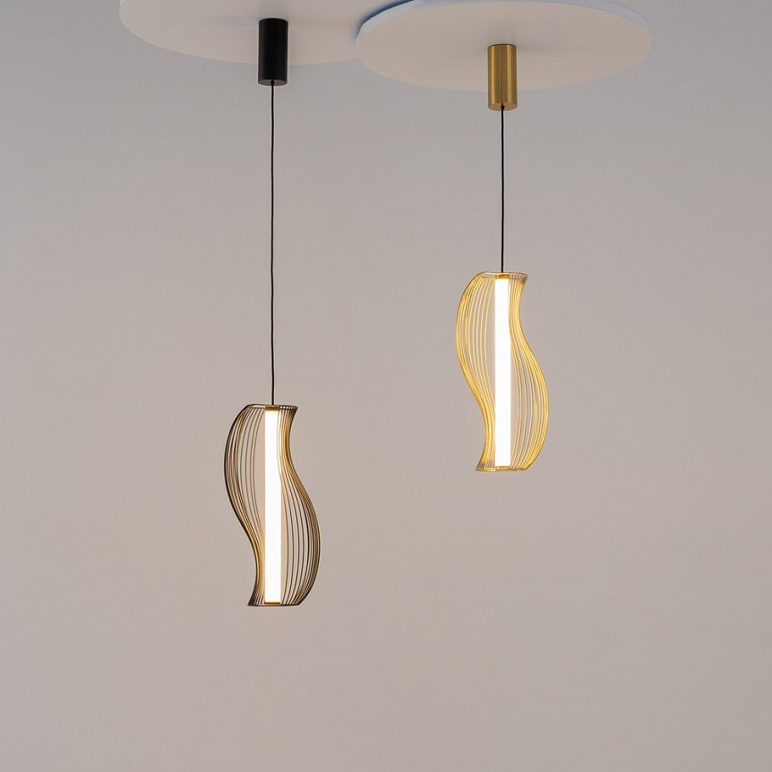 Seria Shadows of Gold invită la o incursiune în designul fluid, unde lumina nu doar iluminează, ci sculptează atmosfera. Structura sa metalică finisată în alamă susține un corp acrilic cu linii sinuoase, care distribuie un flux luminos generos de 1400 Lm într-un mod uniform și cald. Versatilitatea sa este dată de înălțimea minimă de 52 cm, maximă de peste 3,5 metri, făcându-l o alegere magistrală pentru golurile de scară sau holurile monumentale, dar și pentru zone de dinning și livinguri de diferite dimensiuni, unde verticalitatea devine un avantaj estetic. Este un produs dedicat celor care caută o armonie între tehnologia LED eficientă și o estetică impunătoare, sobră, dar plină de caracter.